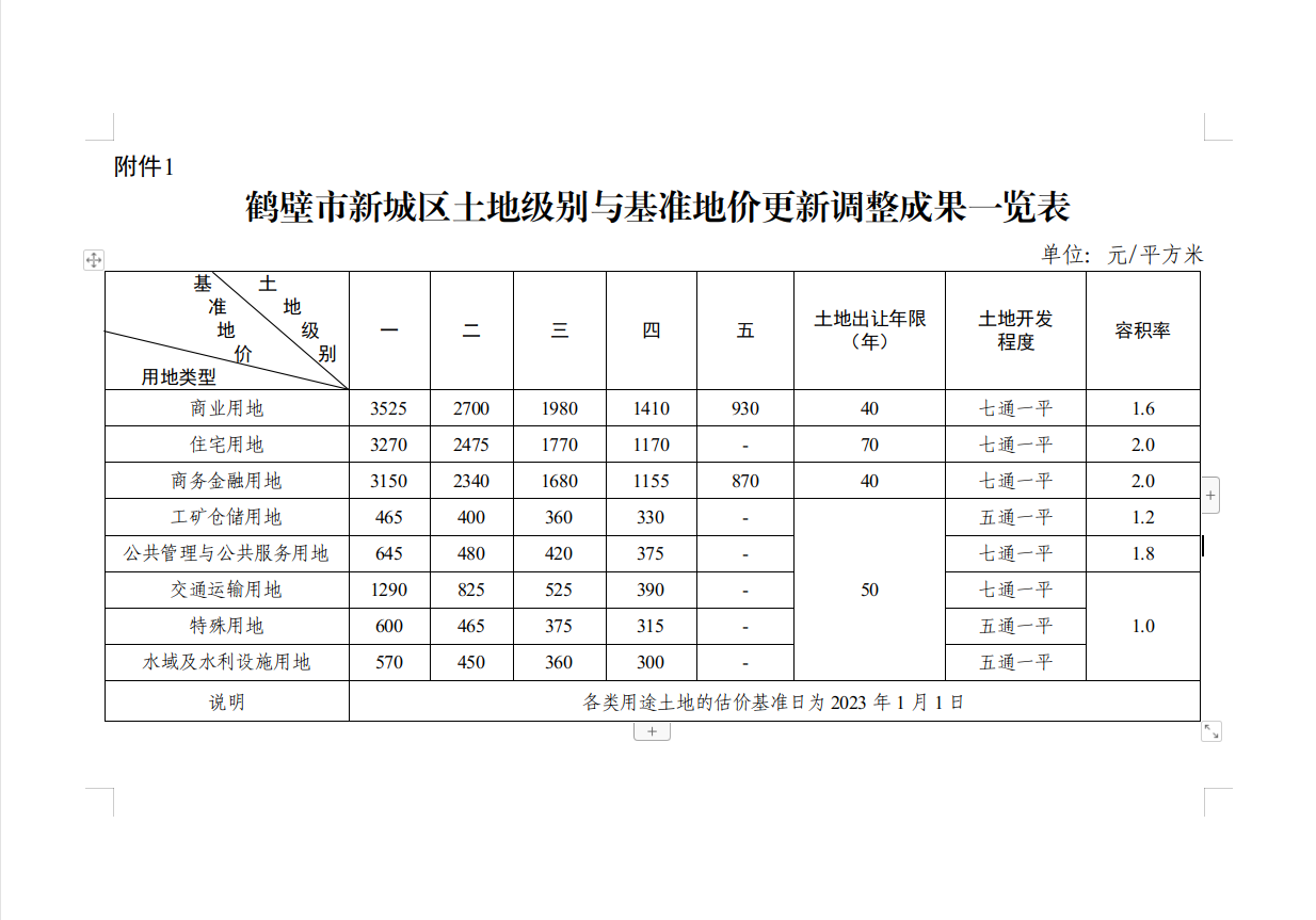 附件:1.鹤壁市本级新城区各类各级土地基准地价表