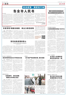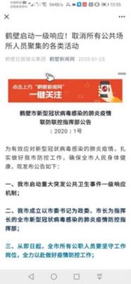 2020年1月24日鹤壁市新型冠状病毒感染的肺炎疫情防控指挥部《告全市人民书》